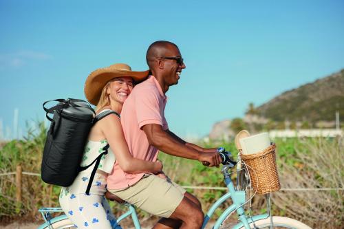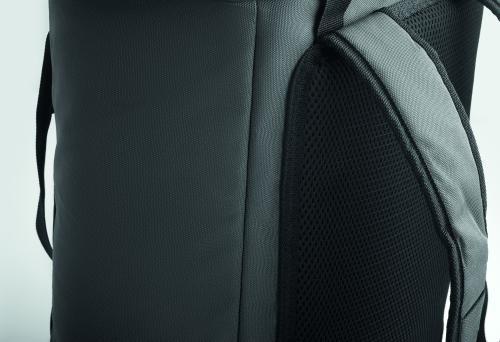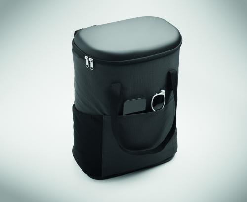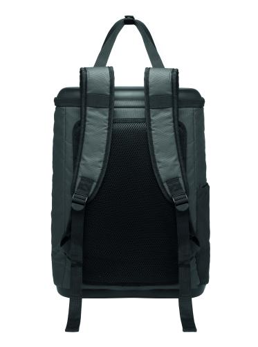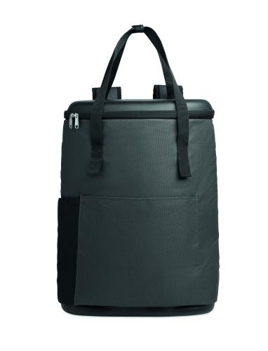 Cooler rucksack made of water-repellent 600D RPET with PE foam insulation and PEVA lining. Features moulded lid, padded mesh back, front zip pocket, and side sandwich mesh pockets. Capacity 20L.