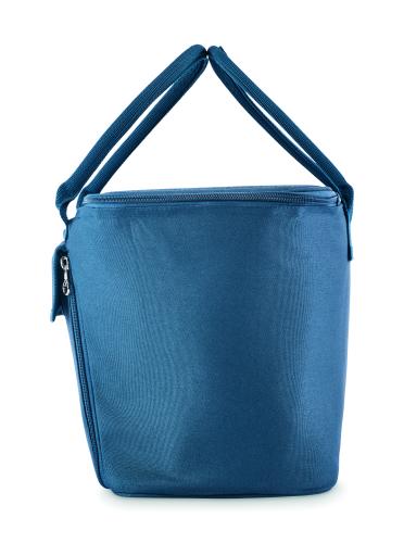 Picnic cooler bag in 600D RPET polyester for 2 people with zippered front pocket including stainless steel cutlery, 2 plates in PS, 2 glasses in PS and 2 cotton napkins. Capacity: 18l