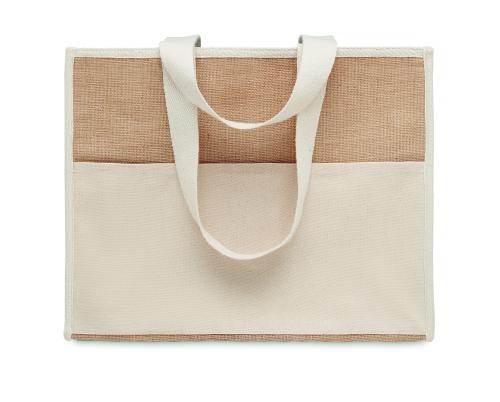 This jute shopping and cooler bag has long handles, a laminated interior for keeping things fresh and a hook and loop closure. The front has a canvas pocket and cotton webbing for smaller items. This jute bag is perfect for daily grocery shopping. This jute bag has a long lifespan which makes it a great alternative to disposable, plastic bags.