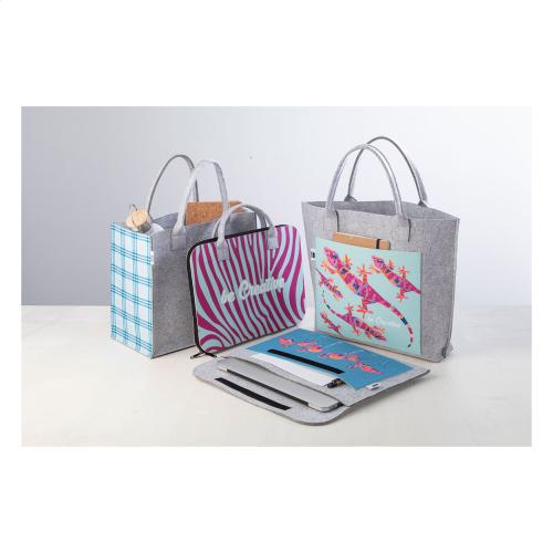 Custom made, RPET felt laptop pouch with full colour printed front pocket and velcro closure. With distinctive RPET label. Fits laptops up to 15". Price includes sublimation printing. MOQ: 25 pcs.