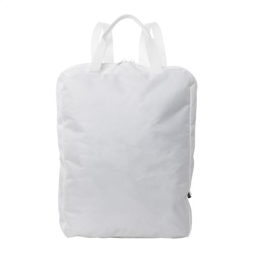 Custom made RPET slim laptop backpack with zipped laptop (15") compartment. With all over sublimation printed graphics. 600D RPET polyester with distinctive RPET label. MOQ: 25 pcs.