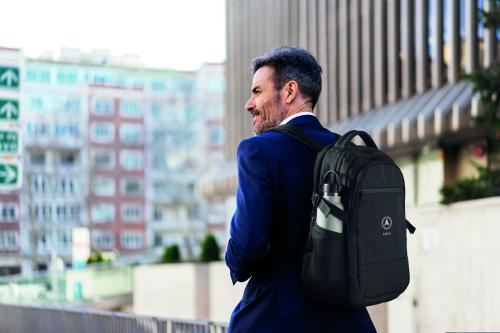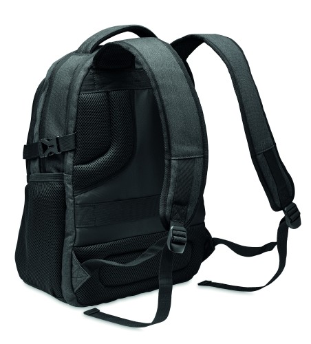 15 inch laptop backpack in 600D RPET polyester. 3 large zippered external compartments fully padded with several inside pockets. It has two mesh side pockets. Adjustable shoulder straps. Padded mesh airflow and trolley holder on reverse side.