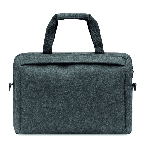 15 inch laptop bag in RPET felt including one main internal compartment and one zippered front pocket. Includes detachable and adjustable shoulder strap. Trolley holder on reverse side.