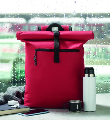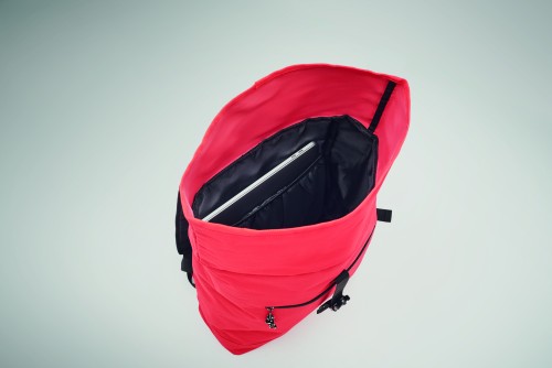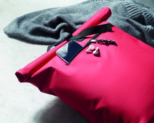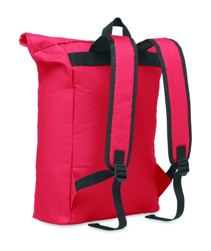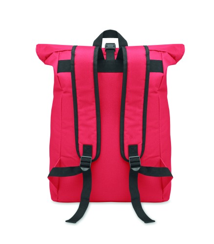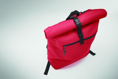 15 inch rolltop laptop backpack in 600D polyester with padded back and base reinforcement. Zippered front pocket. 210D lining.