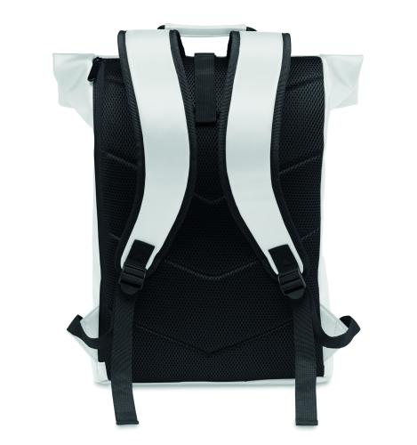 15 inch rolltop laptop backpack in soft PU with padded back and reinforced base. Large front zipped pocket. The lining is 210D RPET.