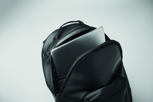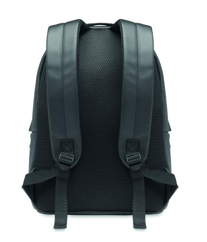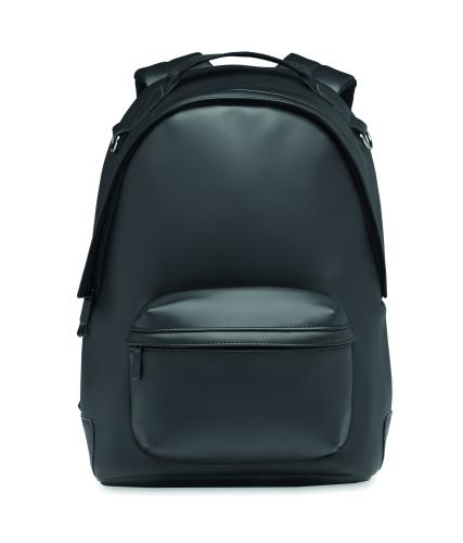 15 inch laptop backpack in soft PU with padded back and reinforced base. Front zipped pocket. The lining is 210D RPET.