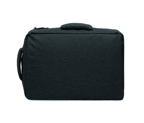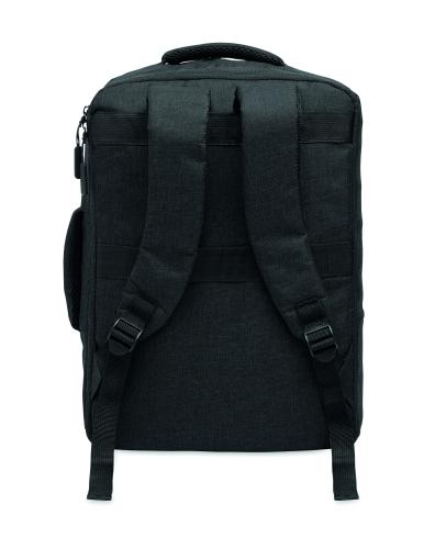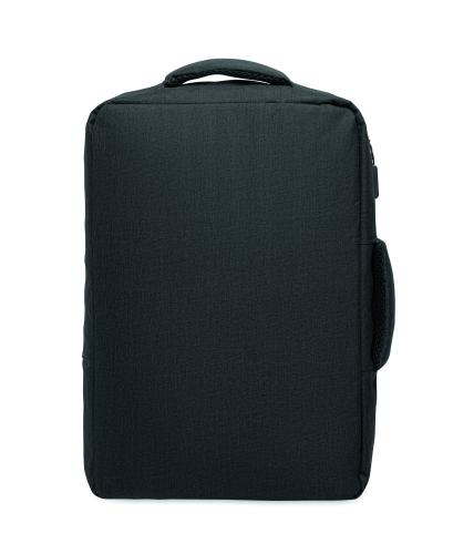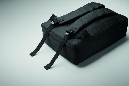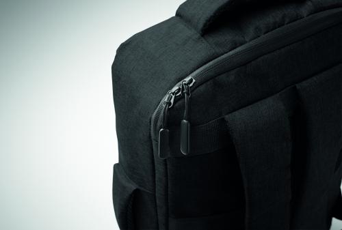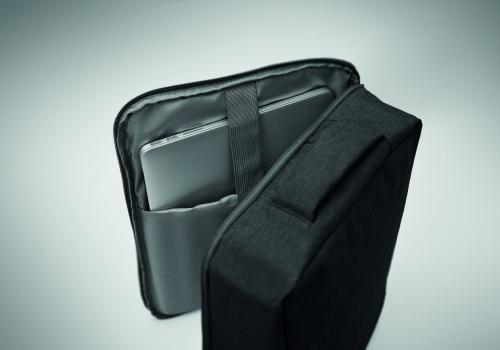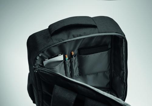 Slim 15 inch laptop backpack in 300D RPET with safe 180 degree opening with 210D RPET lining. Includes laptop compartment, 2 internal slip pockets, 2 internal pen pockets and 2 padded carry handles. Soft padded back and shoulder straps. Suitcase sleeve.