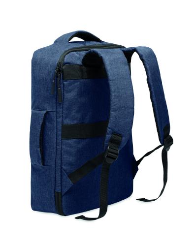 Slim 15 inch laptop backpack in 300D RPET with safe 180 degree opening with 210D RPET lining. Includes laptop compartment, 2 internal slip pockets, 2 internal pen pockets and 2 padded carry handles. Soft padded back and shoulder straps. Suitcase sleeve.
