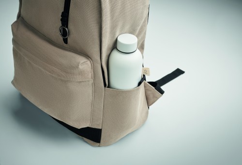 15inch laptop backpack in recycled washed canvas. Large front zippered pocket with inner laptop compartment. Small front zippered pocket. Two side-slip pockets. Padded back and shoulder straps, back panel and base. 450 gr/m².