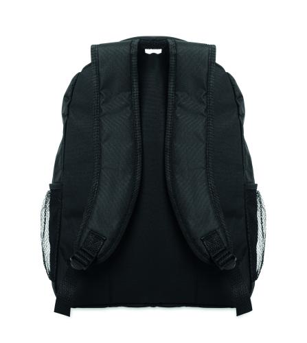Laptop backpack 15inch in 600D RPET polyester with padded laptop compartment inside, mesh pockets on both sides and zippered front pocket.