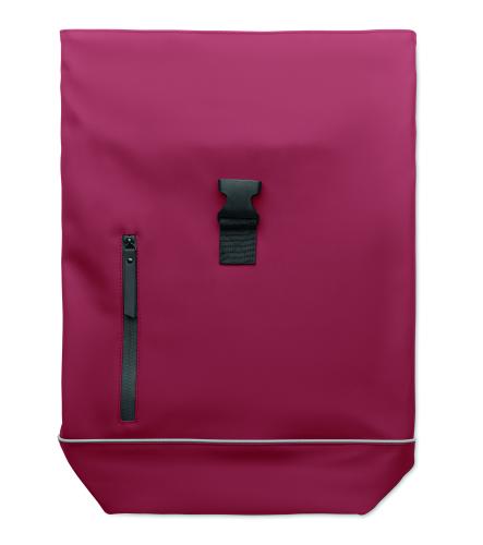 15 inch roll top laptop backpack in soft PU with padded back and base reinforcement with reflective strip. Waterproof zippered front pocket. 210D RPET polyester lining.