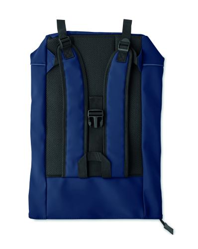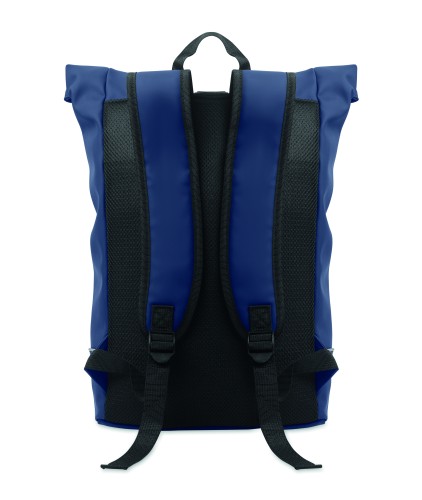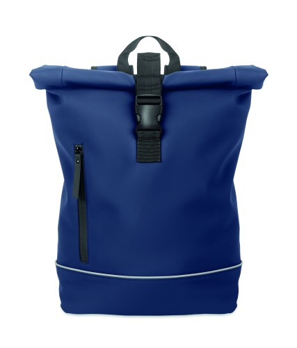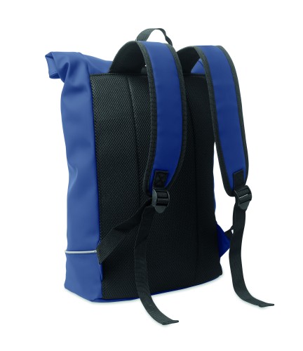15 inch roll top laptop backpack in soft PU with padded back and base reinforcement with reflective strip. Waterproof zippered front pocket. 210D RPET polyester lining.