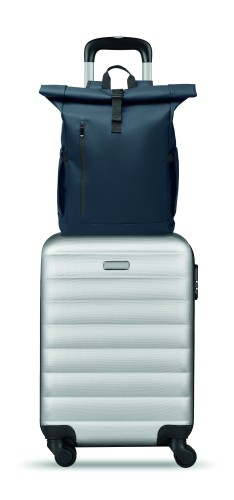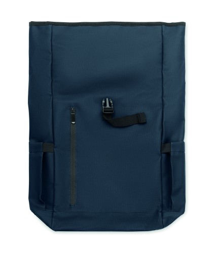 Roll top 15 inch laptop backpack in PU coated 600D RPET polyester and RPET polyester lining. Meshed padded back with zippered pocket and trolley strap. Padded shoulder strap with mesh inside finishing.