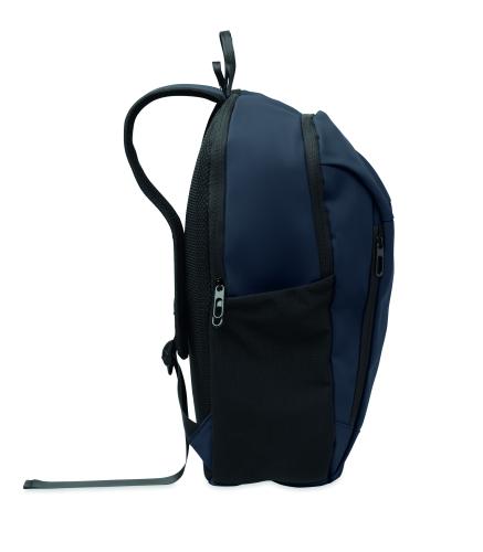 15 inch laptop backpack in soft PU with padded back and hidden zippered main compartment. 1 zippered front pocket, 2 front side zippered pockets and 2 elastic mesh side pockets. With 210D RPET lining.