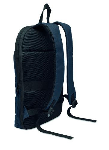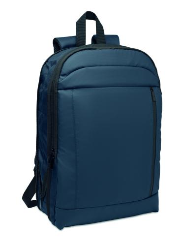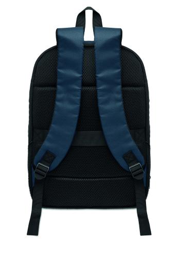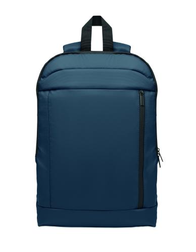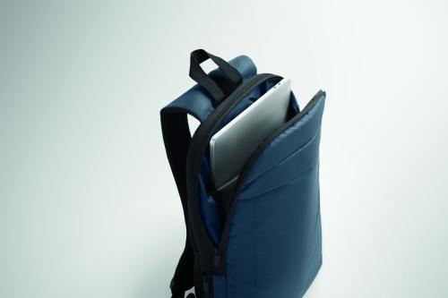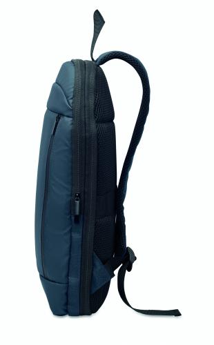 Expandable 600D RPET polyester computer backpack 16'' with PU coating on front and RPET polyester lining. Hidden zippered pocket and padded laptop compartment, front compartment, mesh back and luggage strap.