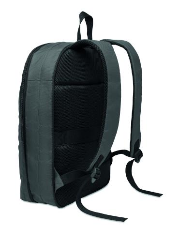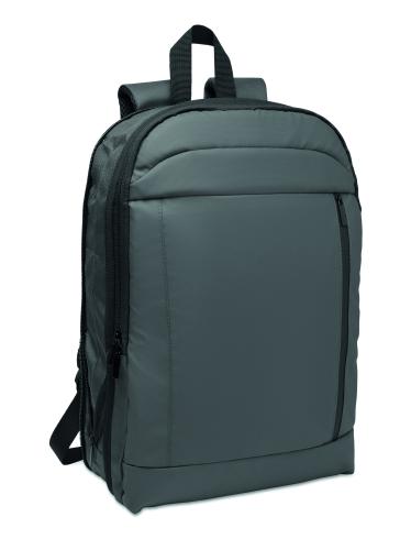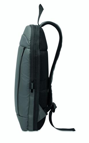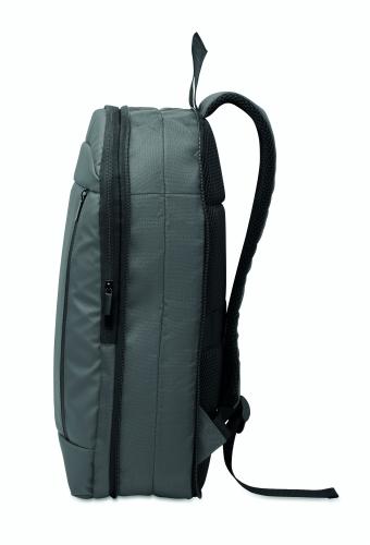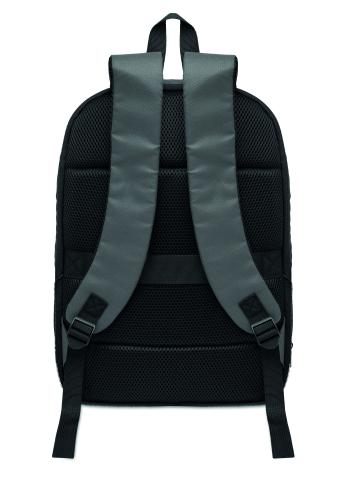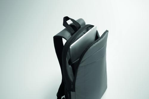 Expandable 600D RPET polyester computer backpack 16'' with PU coating on front and RPET polyester lining. Hidden zippered pocket and padded laptop compartment, front compartment, mesh back and luggage strap.