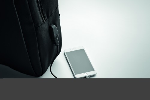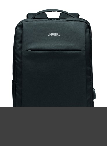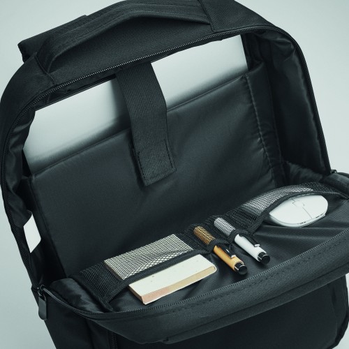 Laptop backpack in 300D RPET Polyester with padded shoulder strap including one main internal compartment for 16 inch laptop and a USB charging cable.