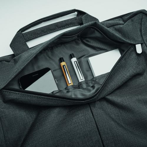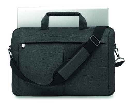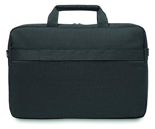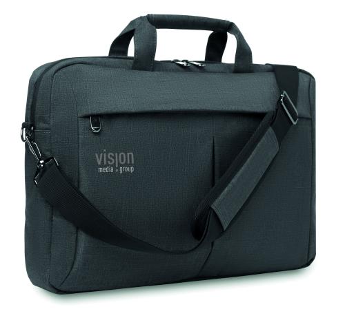Laptop bag in 360D 2 tone polyester including one main internal compartment for 15 inch laptop and one zippered front pocket. Includes detachable and adjustable shoulder strap. Trolley holder on back side.