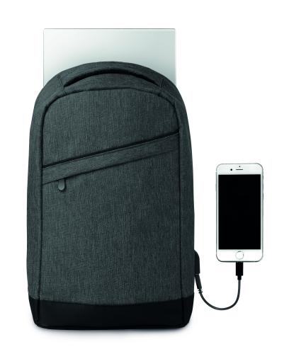600D 2 tone Polyester backpack with padded shoulder strap with main internal compartment. Includes one internal 13'' laptop compartment and an USB charging cable. Zipper main compartment on backside for better protection.