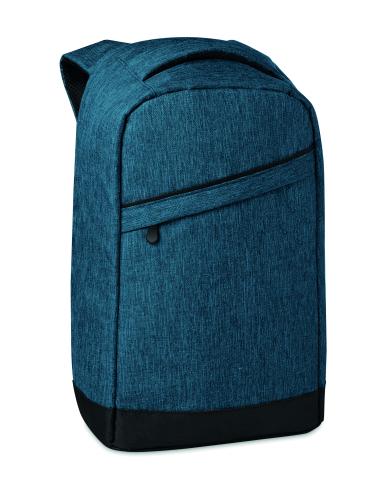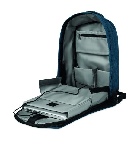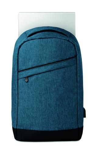 600D 2 tone Polyester backpack with padded shoulder strap with main internal compartment. Includes one internal 13'' laptop compartment and an USB charging cable. Zipper main compartment on backside for better protection.