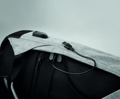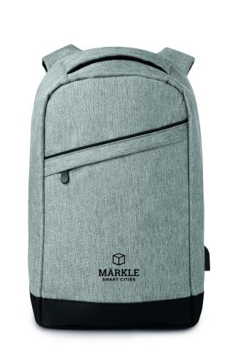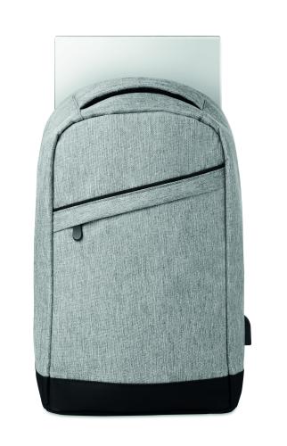 600D 2 tone Polyester backpack with padded shoulder strap with main internal compartment. Includes one internal 13'' laptop compartment and an USB charging cable. Zipper main compartment on backside for better protection.