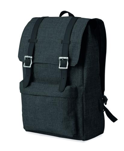 Laptop backpack in 600D 2 tone polyester with padded shoulder strap including one main internal compartment for 15 inch laptop and a USB charging cable. Includes magnetic snap button closure and one zippered front compartment.