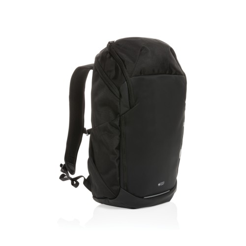 Swiss Peak AWARE™ RPET 15.6 inch business backpack is a weather-resistant backpack for work and everyday adventures. The backpack features a roomy main compartment and on-the-go quick access to your laptop via the side zipper. Comfortable to wear thanks to the contoured, breathable shoulder straps, padded back panel and fully adjustable chest trap. A top zipper pocket holds all your daily essentials. The exterior is made with PU and 1200D recycled polyester. The lining is made with 100% 150D recycled polyester. With AWARE™ tracer that validates the genuine use of recycled materials. Each bag has reused 38.19 0.5L PET bottles. 2% of proceeds of each product sold containing AWARE™ will be donated to Water.org.