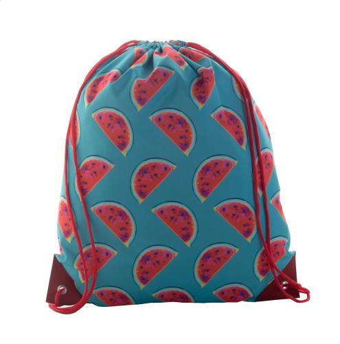 Custom made drawstring bag with reinforced PU leather corners and matching colour strings, 190T polyester. With all over sublimation printed graphics. MOQ: 25 pcs.