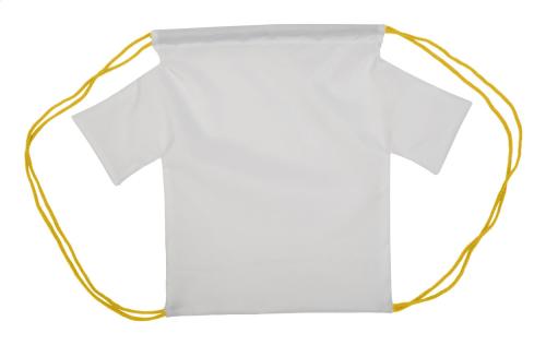 Custom made, T-shirt shaped drawstring bag with coloured strings, 190T polyester. With all over sublimation printed graphics. MOQ: 25 pcs.