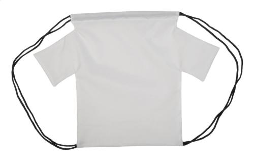 Custom made, T-shirt shaped drawstring bag with coloured strings, 190T polyester. With all over sublimation printed graphics. MOQ: 25 pcs.