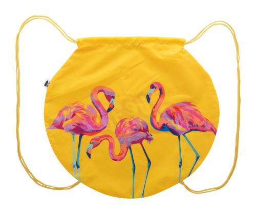 Custom made, ball shaped drawstring bag with coloured strings, 190T RPET polyester. With all over sublimation printed graphics and distinctive RPET label. MOQ: 25 pcs.