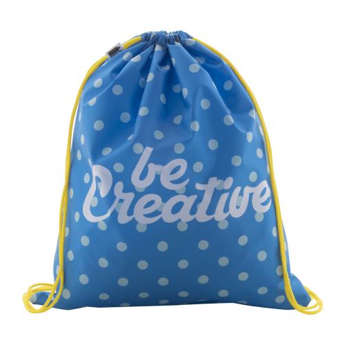 Custom made drawstring bag with coloured strings, 190T RPET polyester. With all over sublimation printed graphics and distinctive RPET label. MOQ: 25 pcs.