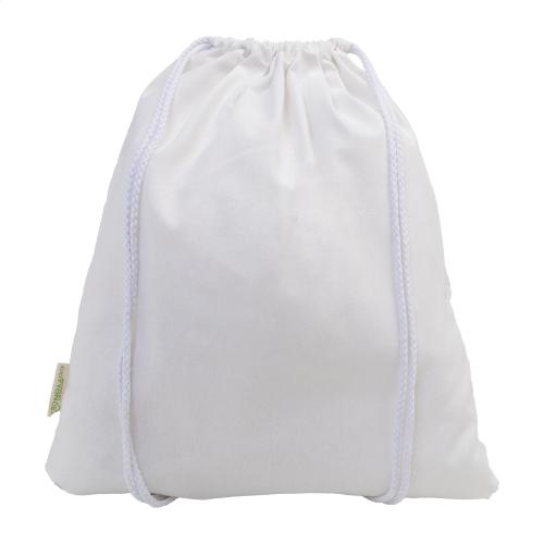 Drawstring bag in 70% recycled cotton and 30% RPET polyester, 140 g/m². With distinctive recycled cotton label.