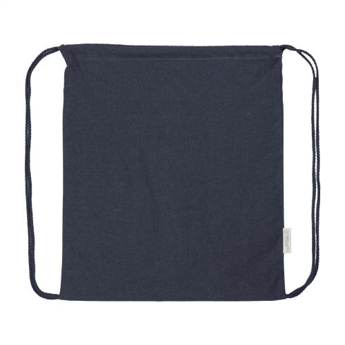 Drawstring bag in 70% recycled cotton and 30% RPET polyester, 140 g/m². With distinctive recycled cotton label.