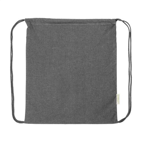Drawstring bag in 70% recycled cotton and 30% RPET polyester, 140 g/m². With distinctive recycled cotton label.