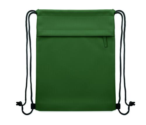 Drawstring bag with PU coated 600D RPET polyester and 190T RPET polyester lining. Zippered front pocket.