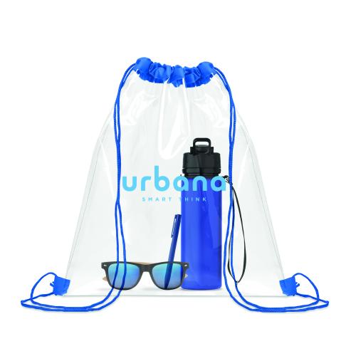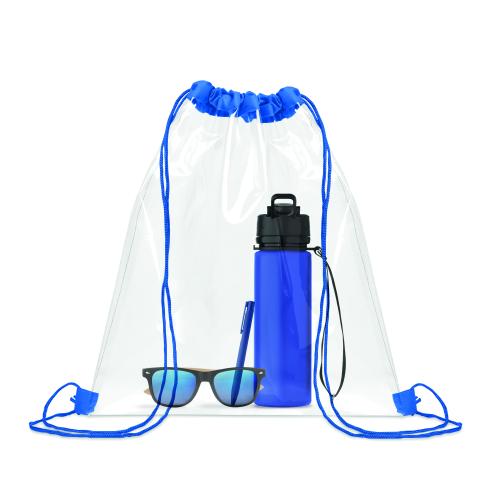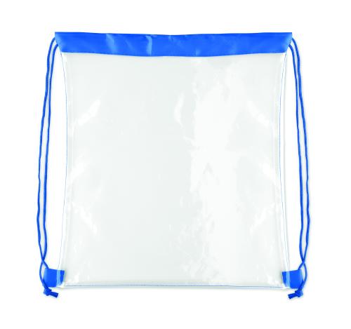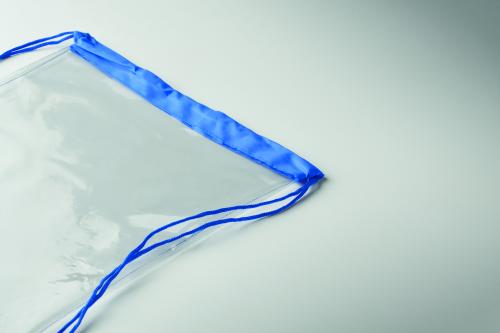 Transparent drawstring bag in EVA and PVC. Polyester cords.