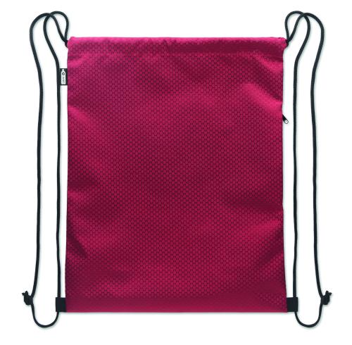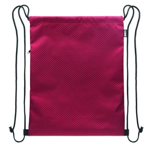 Drawstring bag in 420D RPET polyester with vertical side zip pocket and RPET 210D lining. Features durable cords on both sides. Capacity 4.5L, max load 5 kg.