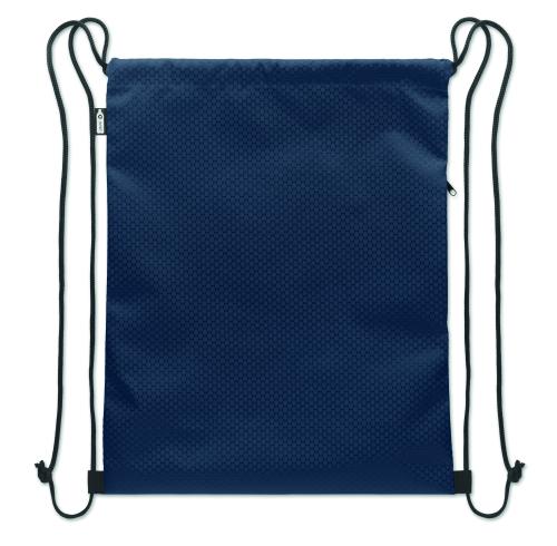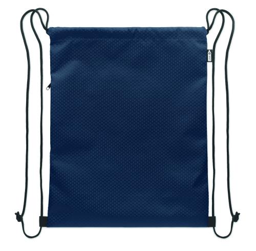 Drawstring bag in 420D RPET polyester with vertical side zip pocket and RPET 210D lining. Features durable cords on both sides. Capacity 4.5L, max load 5 kg.