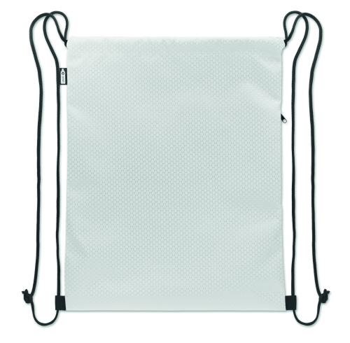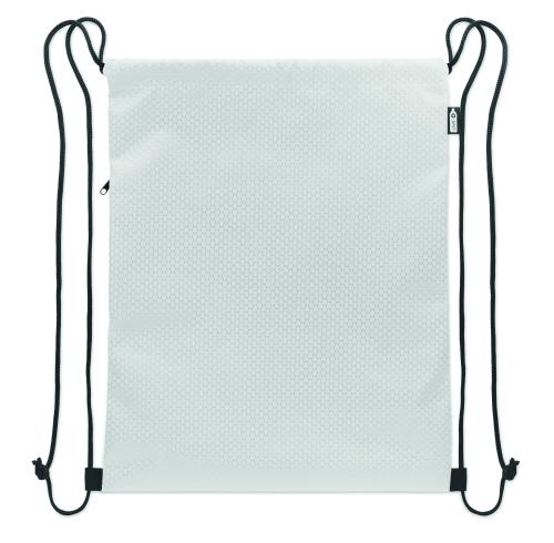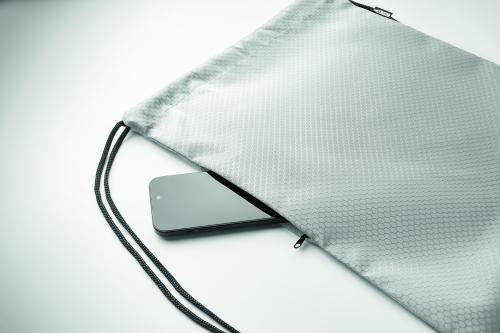 Drawstring bag in 420D RPET polyester with vertical side zip pocket and RPET 210D lining. Features durable cords on both sides. Capacity 4.5L, max load 5 kg.