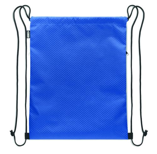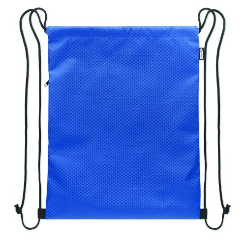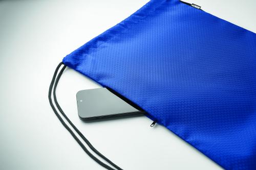 Drawstring bag in 420D RPET polyester with vertical side zip pocket and RPET 210D lining. Features durable cords on both sides. Capacity 4.5L, max load 5 kg.