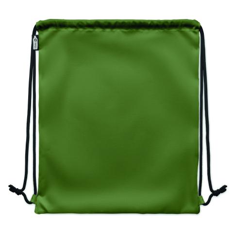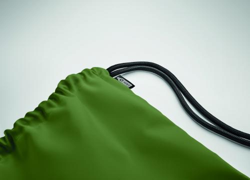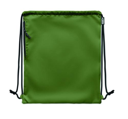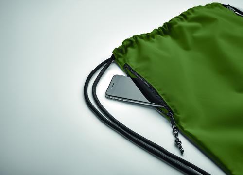 Large drawstring bag in 300D RPET polyester with side zippered outer pocket.