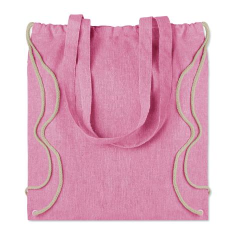 2 tone recycled cotton and recycled polyester shopping bag with drawstring and long handles (20%/80%). Approx. 140 gr/m². This item can shrink after printing.