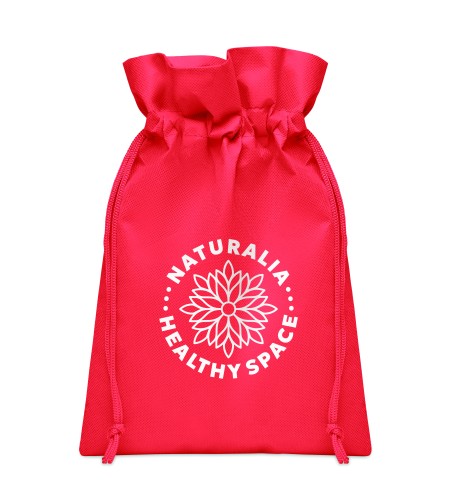 Small gift draw cord bag in RPET non-woven 80 gr/m². Size approx. 20x30 cm.