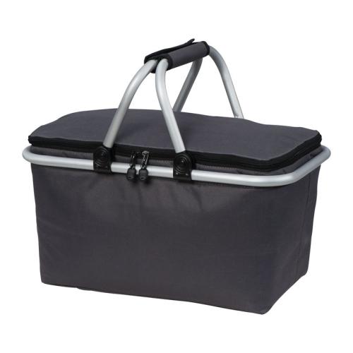 Foldable polyester shopping basket with insulating function and aluminium linkage. A useful companion that can be stored folded to save space.