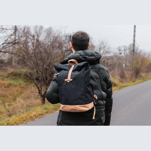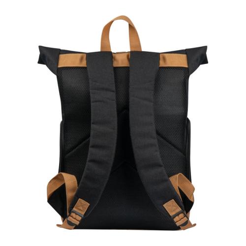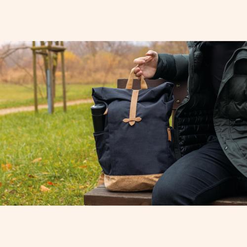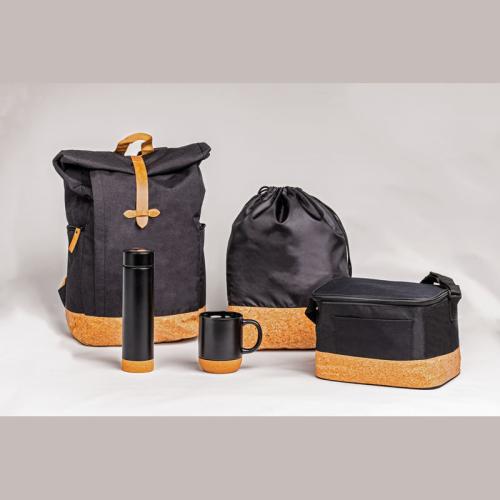 RPET backpack made of 300D two-tone polyester and 210D RPET with a lockable main compartment, two lockable side compartments and a filling capacity of 20 liters. Padded shoulder straps and cork bottom. Easy to close by rolling or folding.