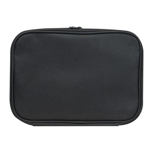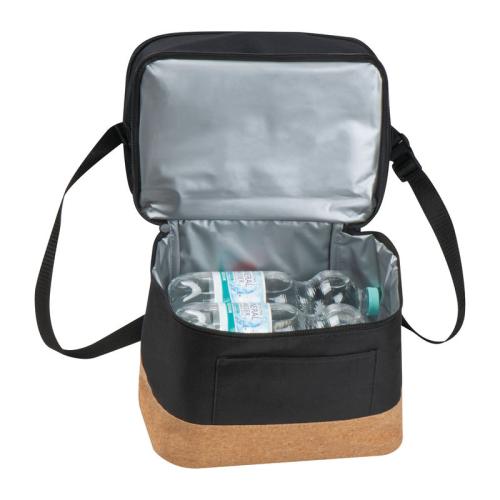 Cooling bag made of RPET with a separate bottom made of cork, front compartment, carrying strap and an extra compartment. Suitable for 6 beverage cans or bottles of 0.5 liters each.