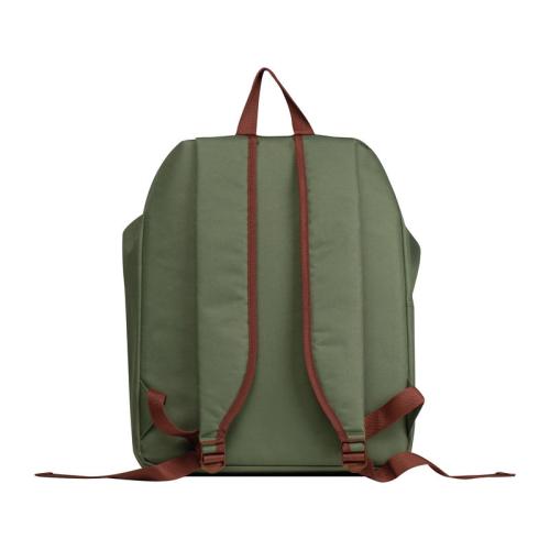 Backpack made of RPET with lapotop compartment, side pocket, front compartment with zipper, shoulder straps, rollable or foldable closure with velcro and plug and a filling capacity of 18 liters.