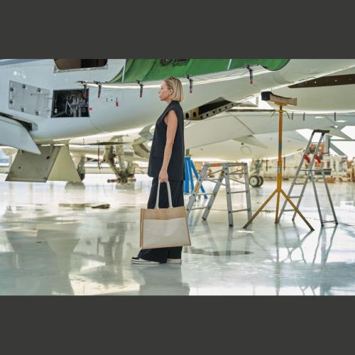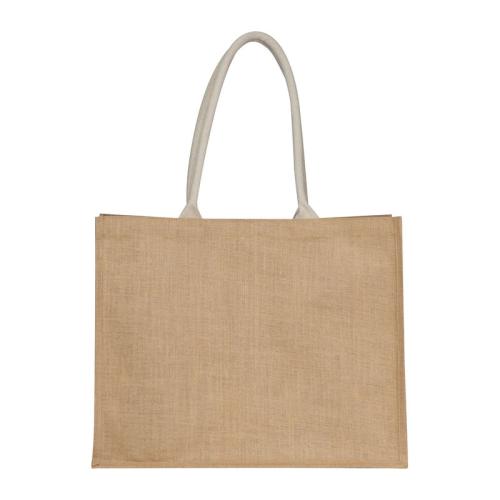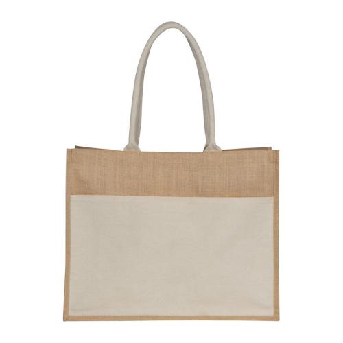 Oeko-Tex® STANDARD 100 certified jute bag with two carrying handles and practical cotton front pocket with Velcro fastener.
