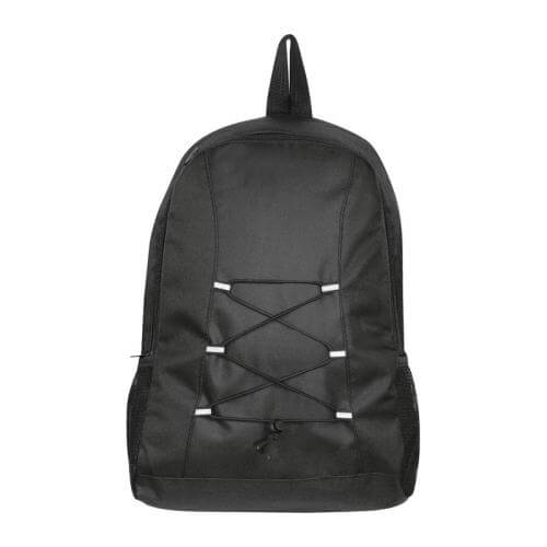Backpack made of 600D recycled polyester with hanging loop, two side mesh pockets and two padded shoulder straps.